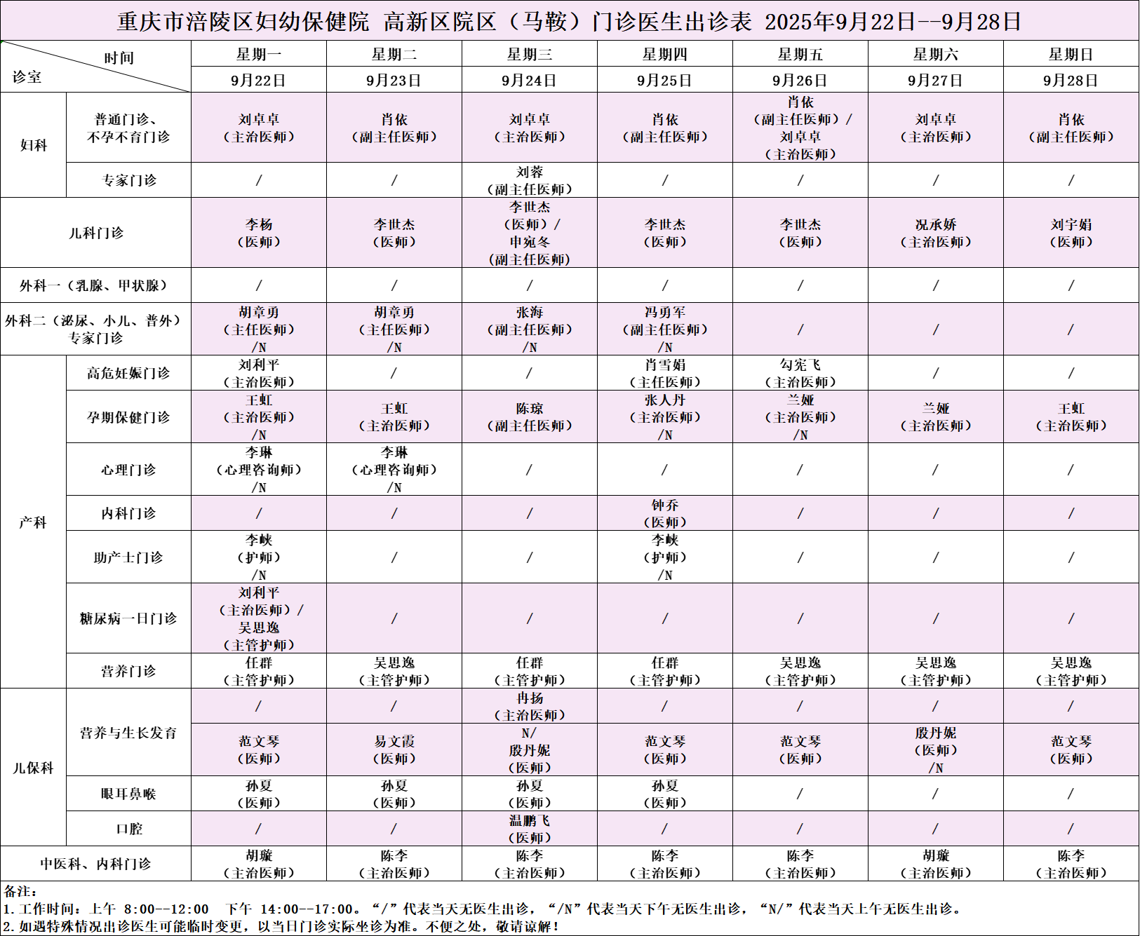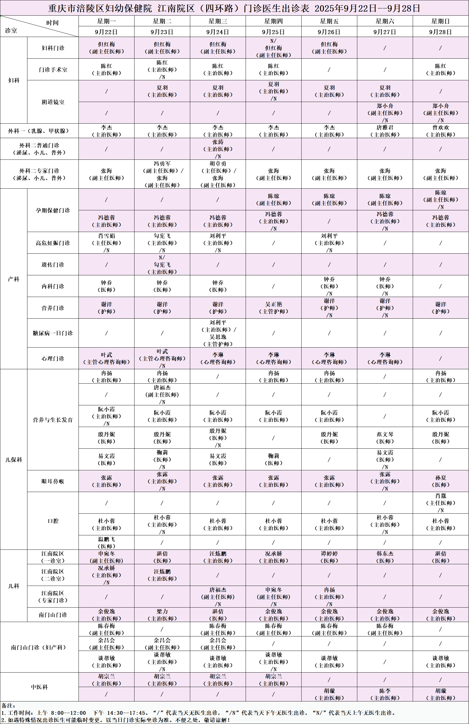 【门诊排班】2025年9月22日—9月28日|重庆市涪陵区妇幼保健院门诊出诊表