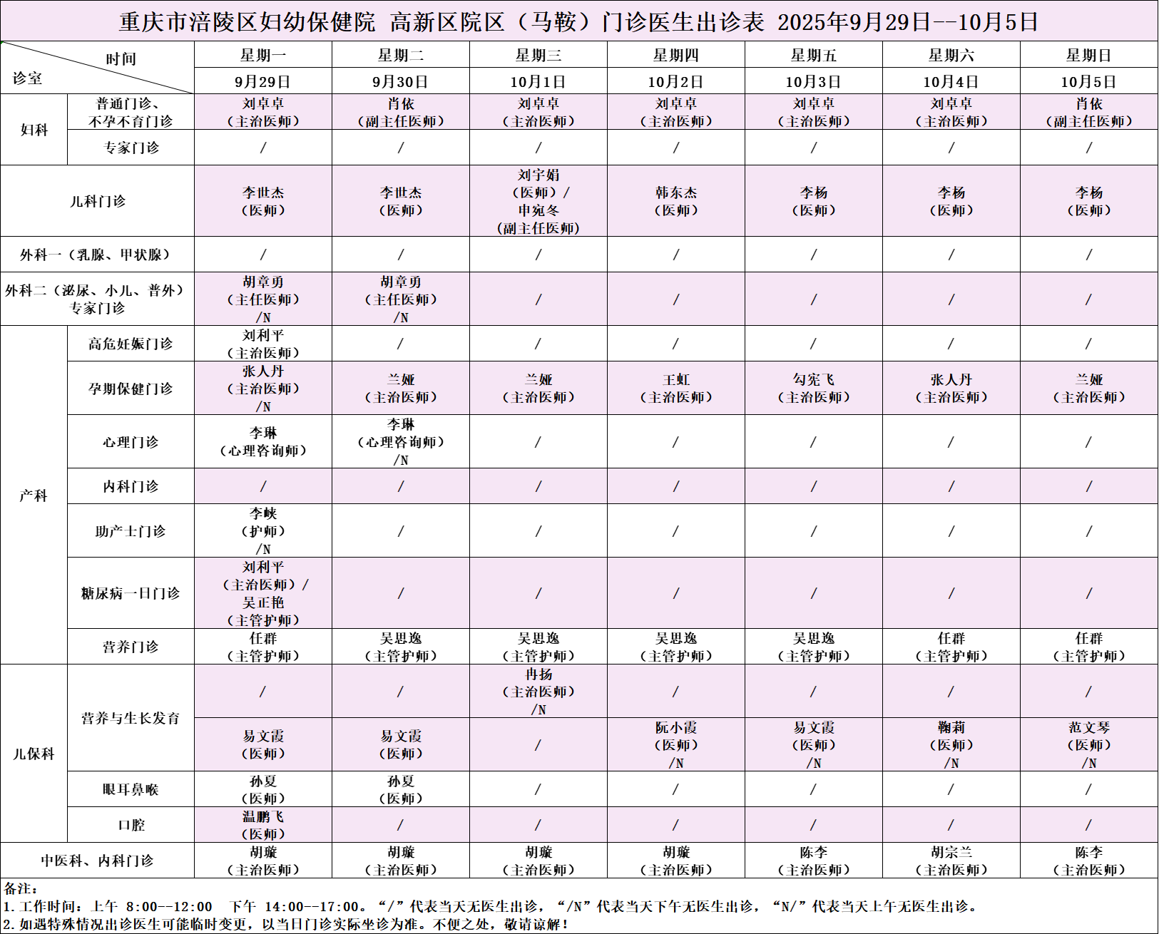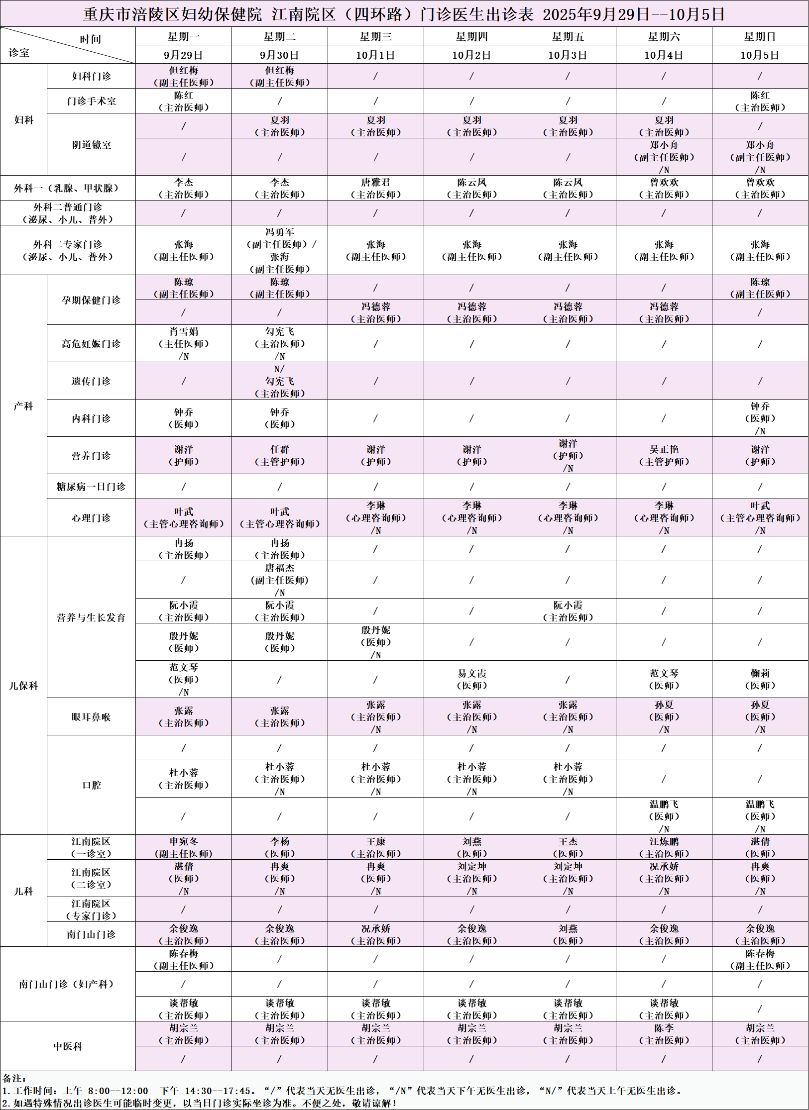 【门诊排班】2025年9月29日—10月5日|重庆市涪陵区妇幼保健院门诊出诊表