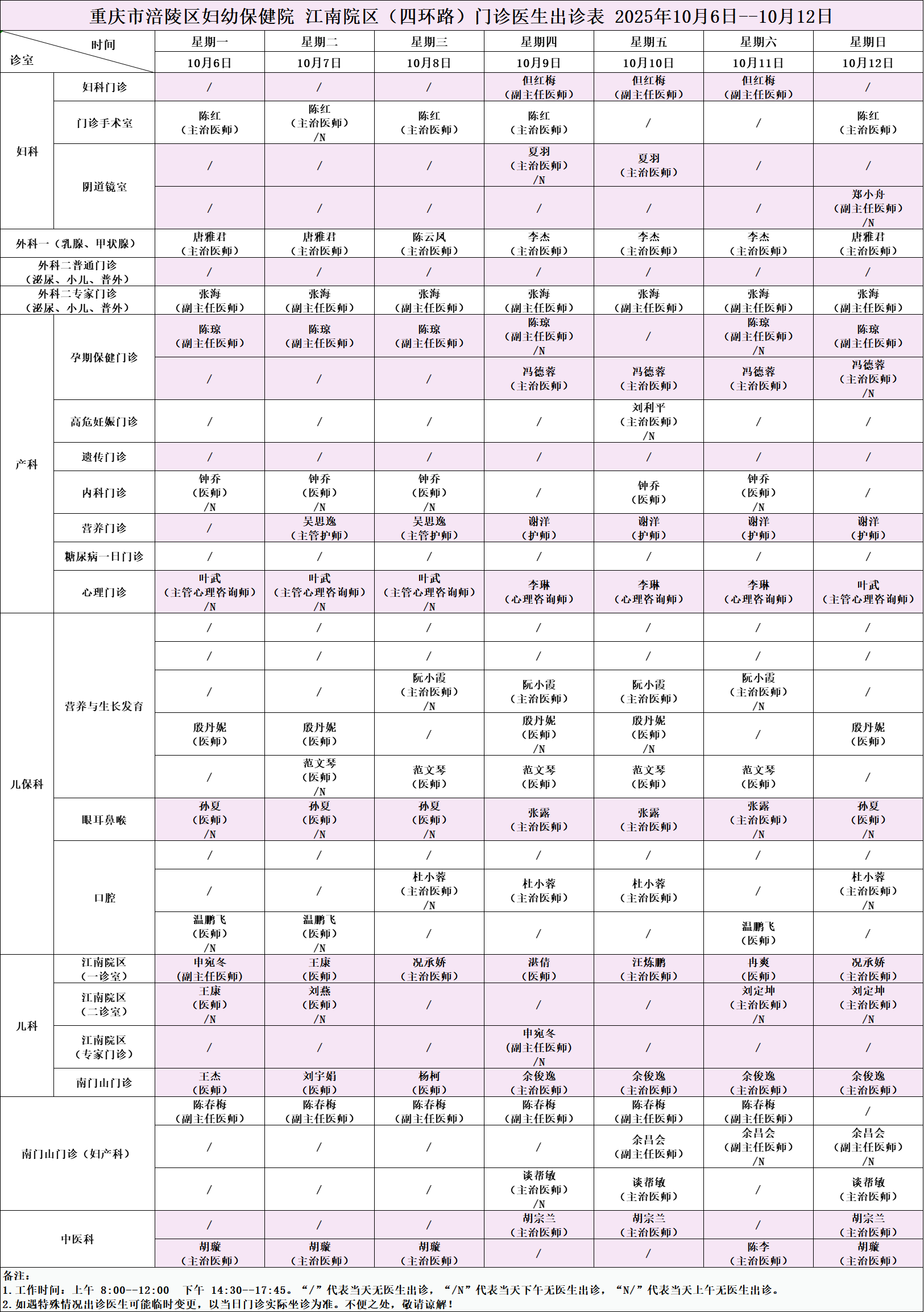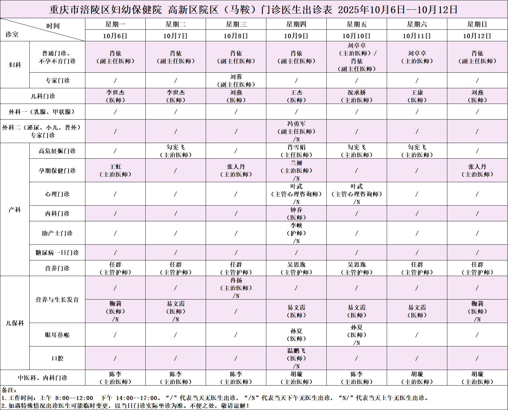 【门诊排班】2025年10月6日—10月12日|重庆市涪陵区妇幼保健院门诊出诊表