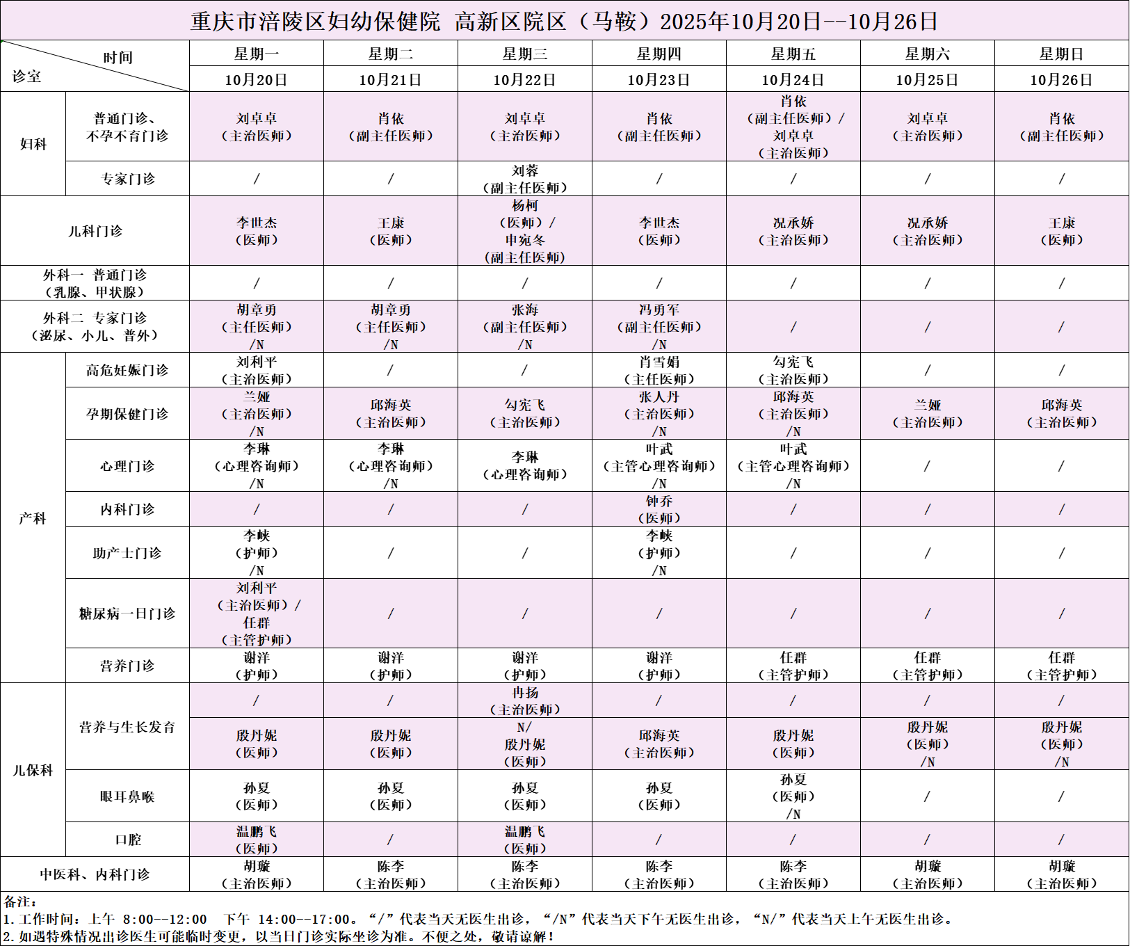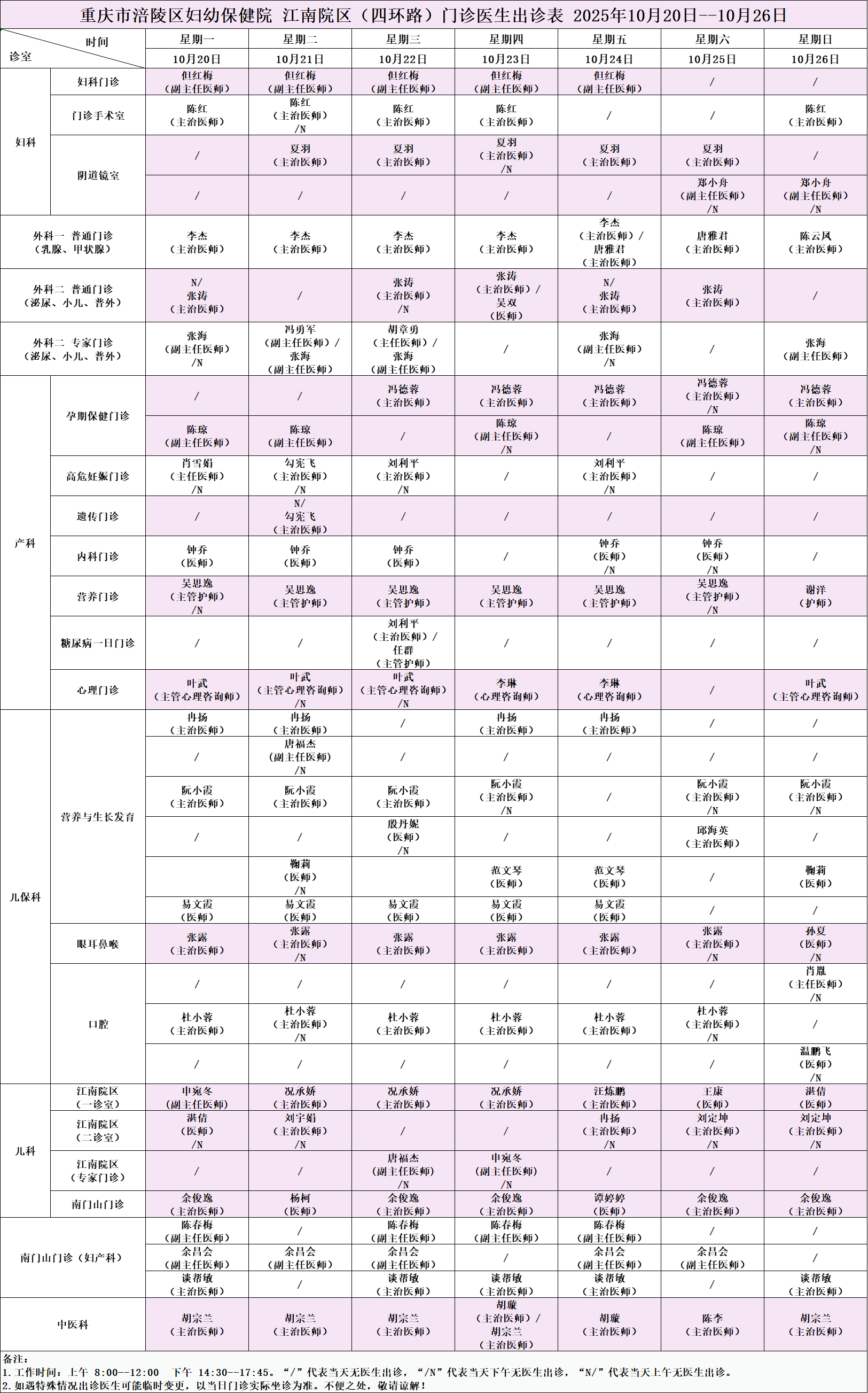 为方便您及时了解我院两院区门诊医生出诊情况,现将下周出诊表公示如下,请您合理安排出行和时间。您还可以关注“重庆市涪陵区妇幼保健院”微信服务号、公众号,在“就诊服务”栏目中在线预约挂号。
