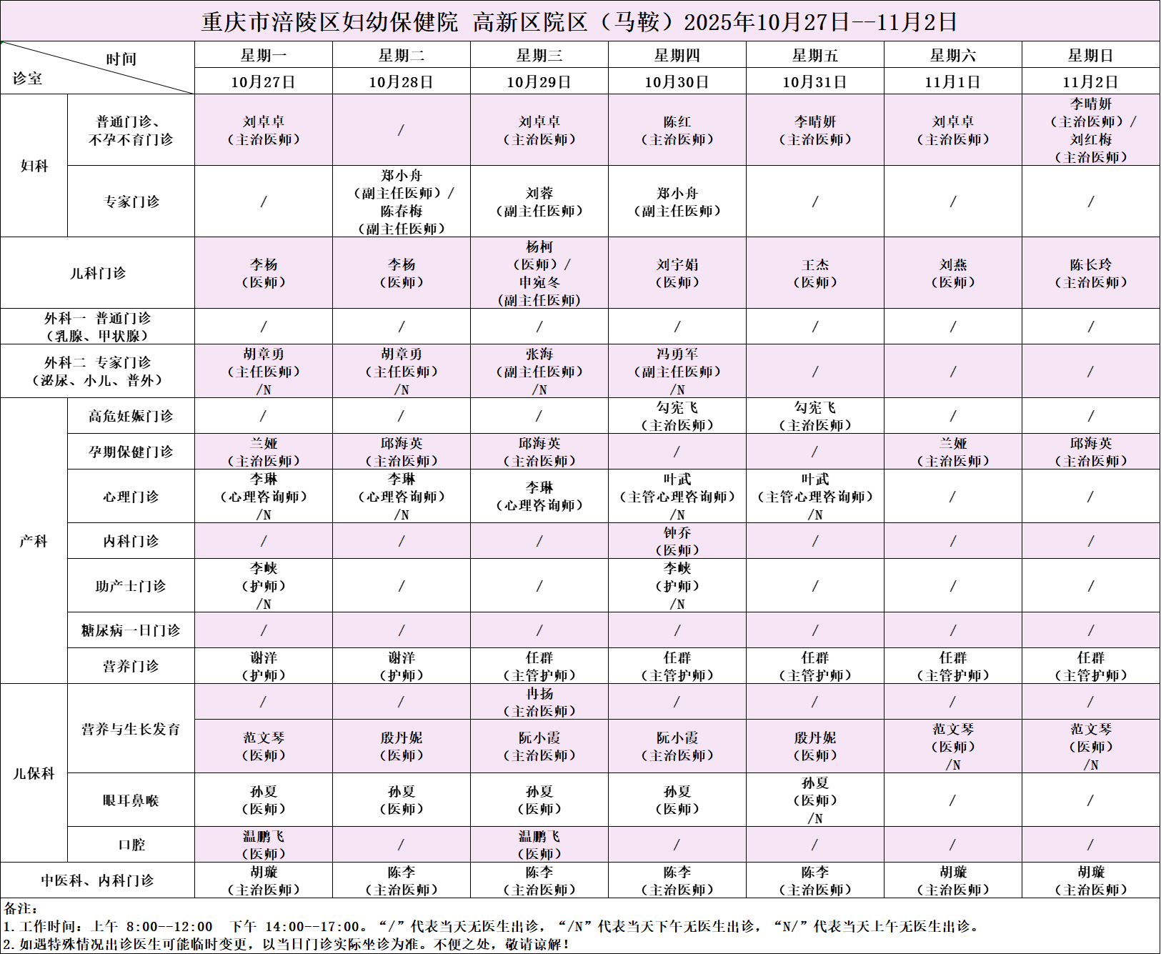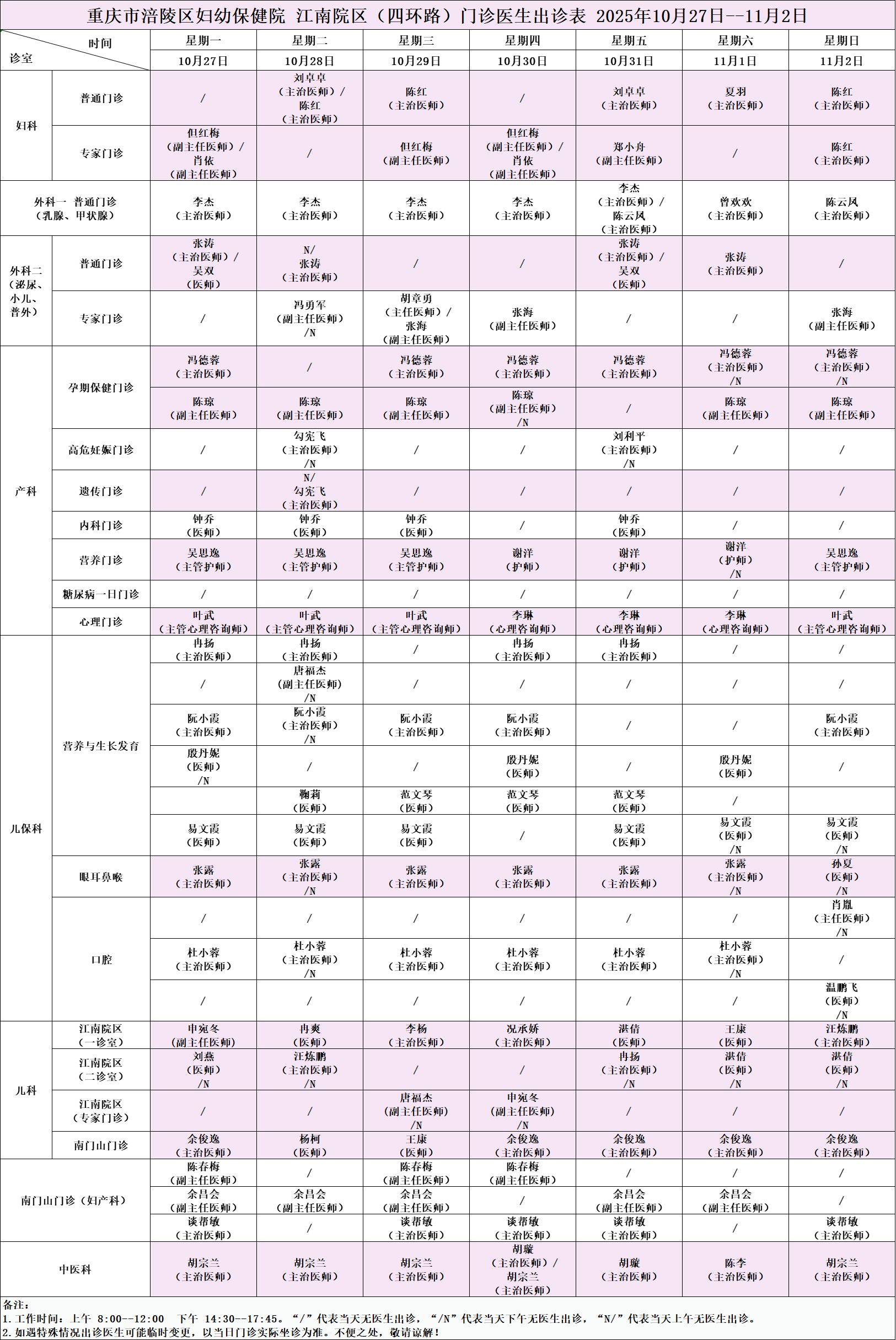 为方便您及时了解我院两院区门诊医生出诊情况,现将下周出诊表公示如下,请您合理安排出行和时间。您还可以关注“重庆市涪陵区妇幼保健院”微信服务号、公众号,在“就诊服务”栏目中在线预约挂号。