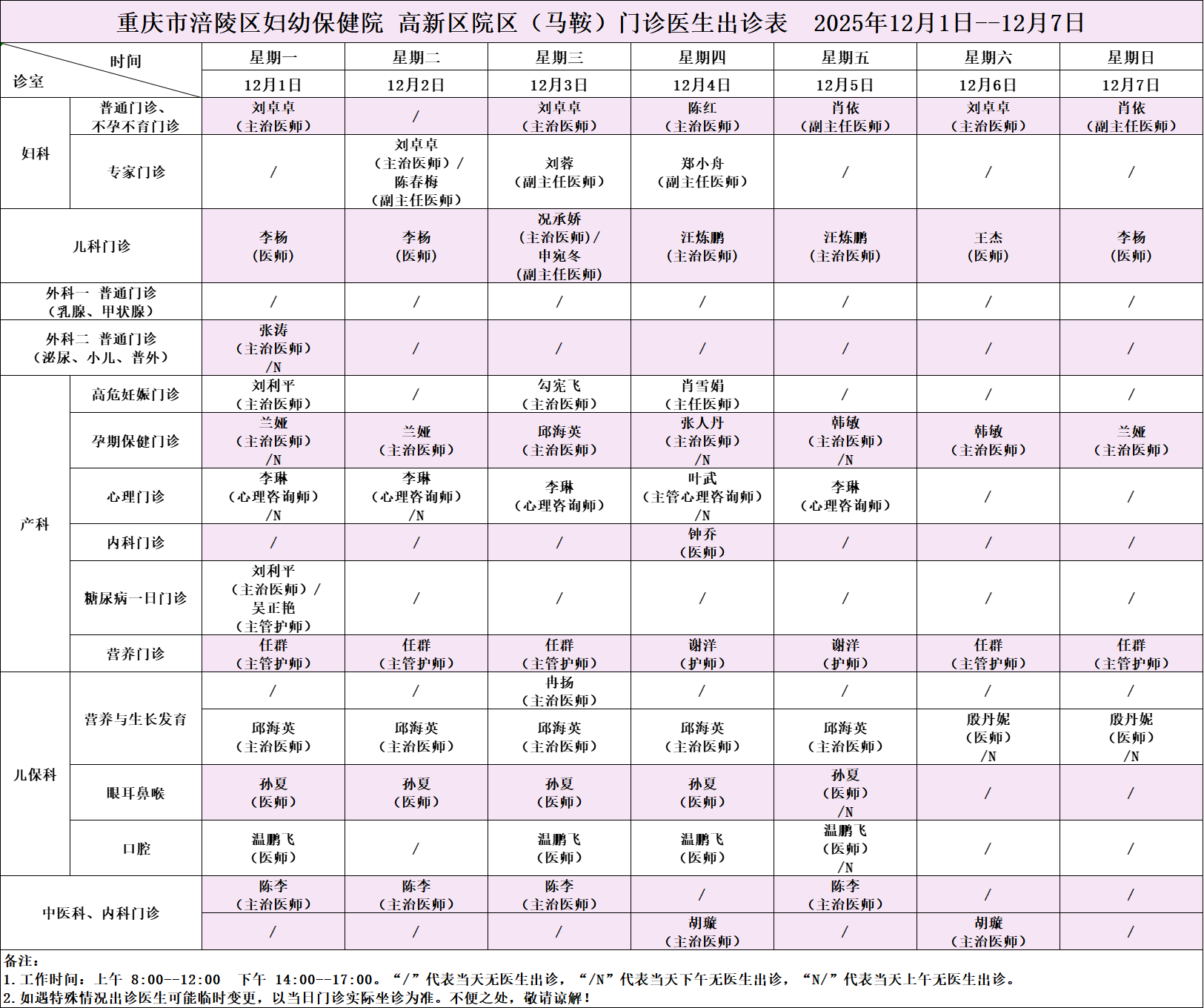 【门诊排班】2025年12月1日—12月7日|重庆市涪陵区妇幼保健院门诊出诊表