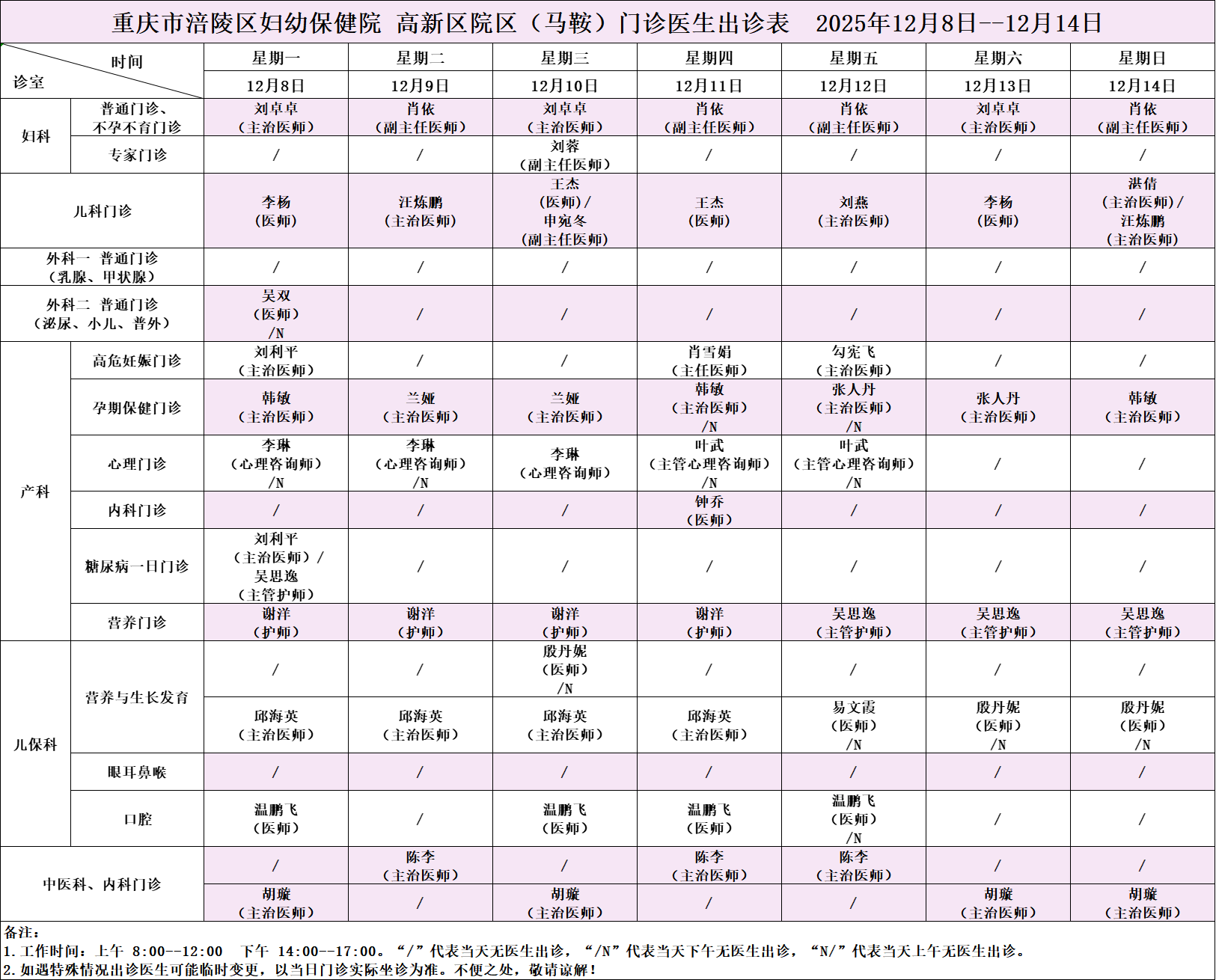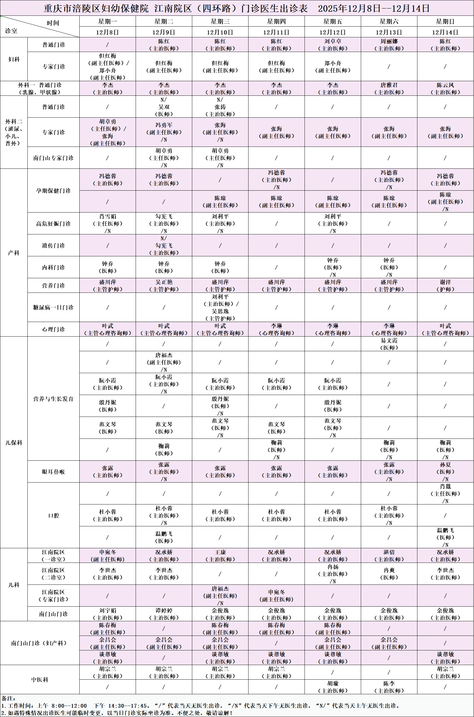 为方便您及时了解我院两院区门诊医生出诊情况,现将下周出诊表公示如下,请您合理安排出行和时间。您还可以关注“重庆市涪陵区妇幼保健院”微信服务号、公众号,在“就诊服务”栏目中在线预约挂号。