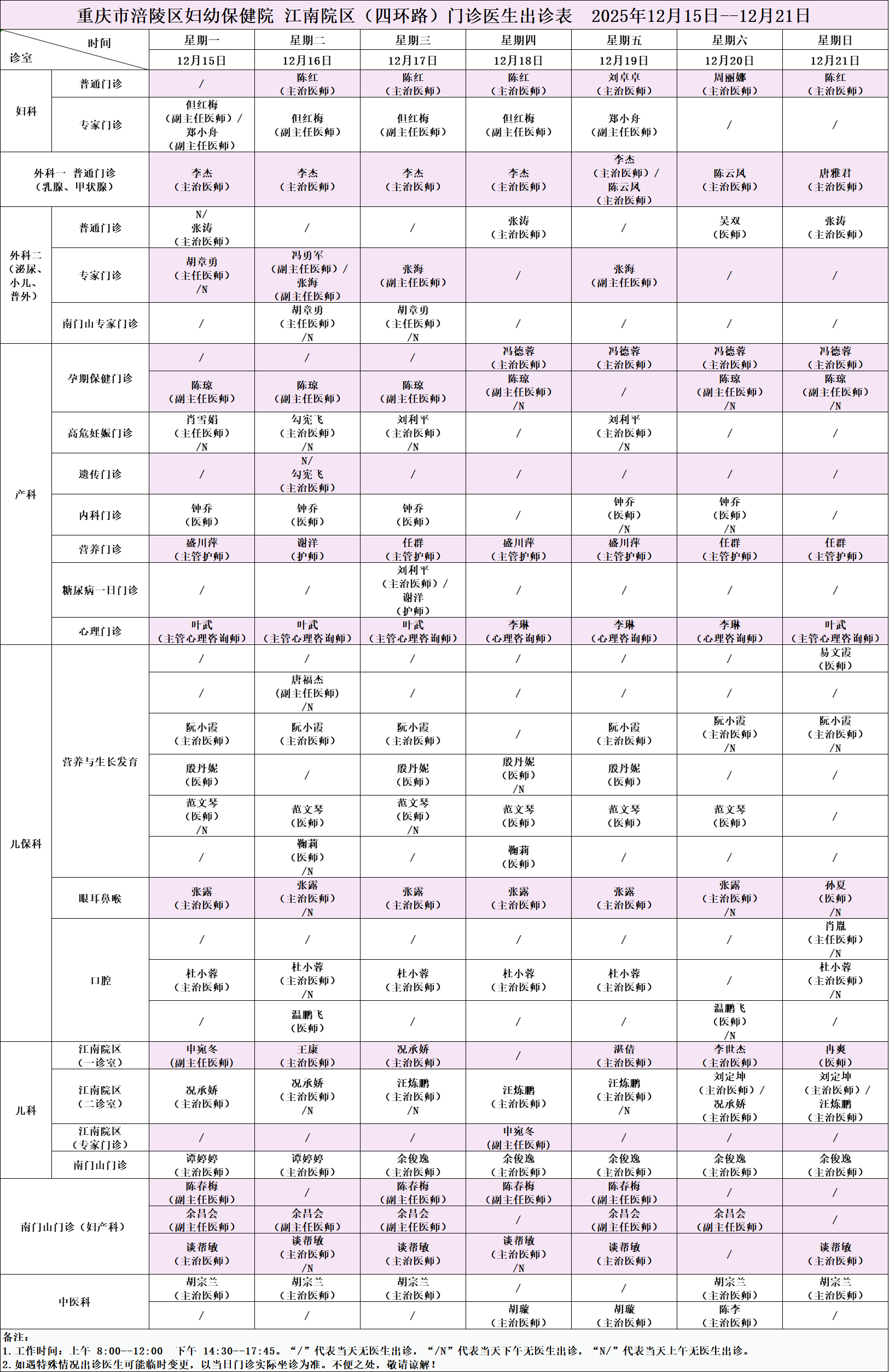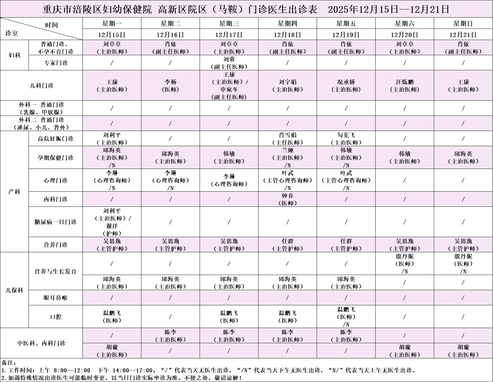 为方便您及时了解我院两院区门诊医生出诊情况,现将下周出诊表公示如下,请您合理安排出行和时间。您还可以关注“重庆市涪陵区妇幼保健院”微信服务号、公众号,在“就诊服务”栏目中在线预约挂号。