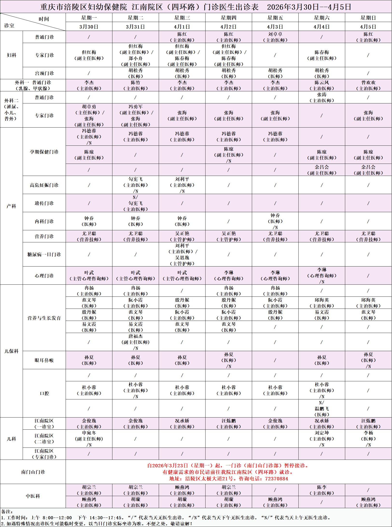【门诊排班】2026年3月30日—4月5日|重庆市涪陵区妇幼保健院门诊出诊表