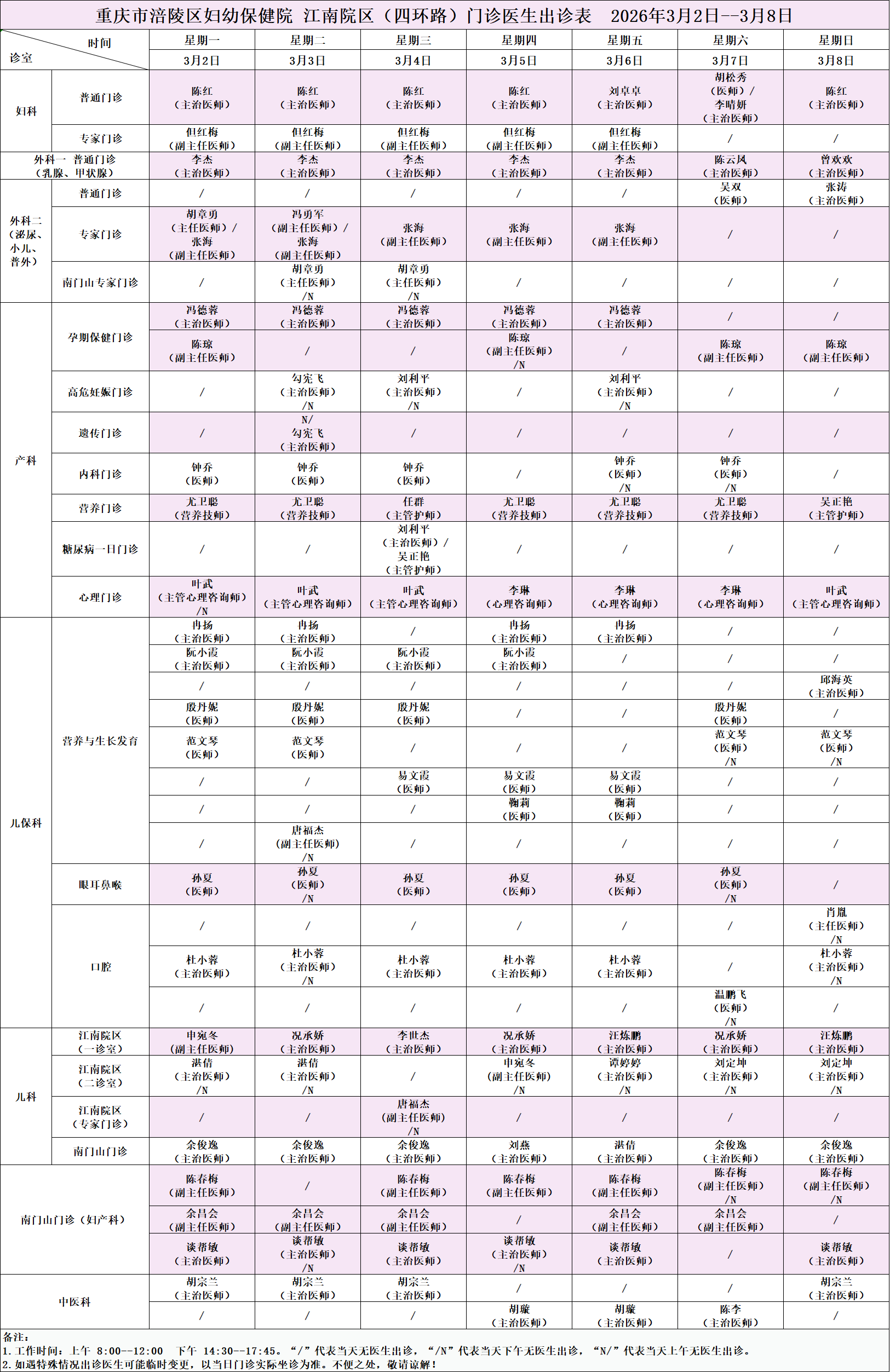 【门诊排班】2026年3月2日—3月8日|重庆市涪陵区妇幼保健院门诊出诊表