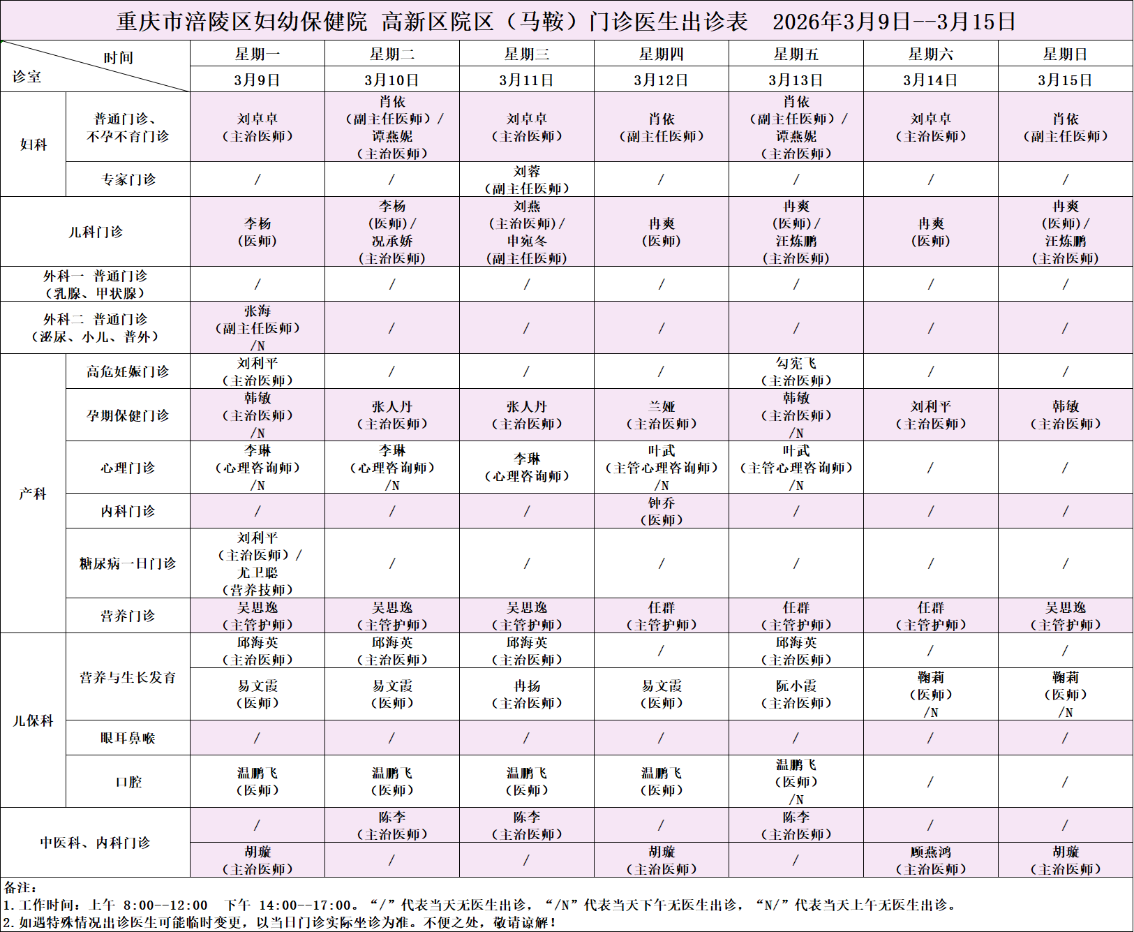 为方便您及时了解我院两院区门诊医生出诊情况,现将下周出诊表公示如下,请您合理安排出行和时间。您还可以关注“重庆市涪陵区妇幼保健院”微信服务号、公众号,在“就诊服务”栏目中在线预约挂号。