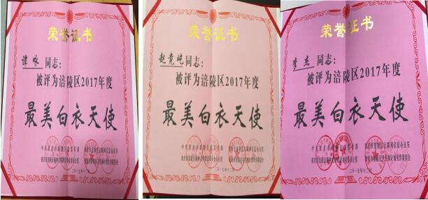 2017年3月—12月,区委宣传部、区网信办、区文明办、区卫生计生委在全区卫生计生系统广泛开展了“最美白衣天使”评选活动。我院儿童保健科谭咏、产科赵竟屹、乳腺科李杰三名医护人员被评为全区“最美白衣天使”。