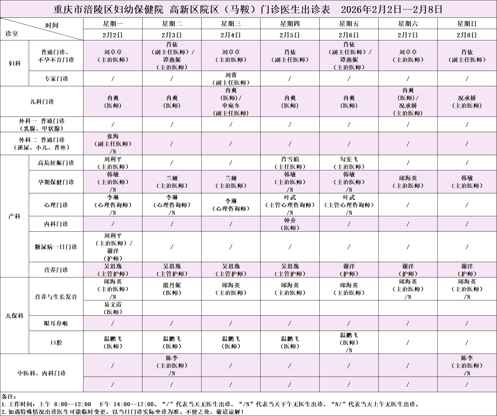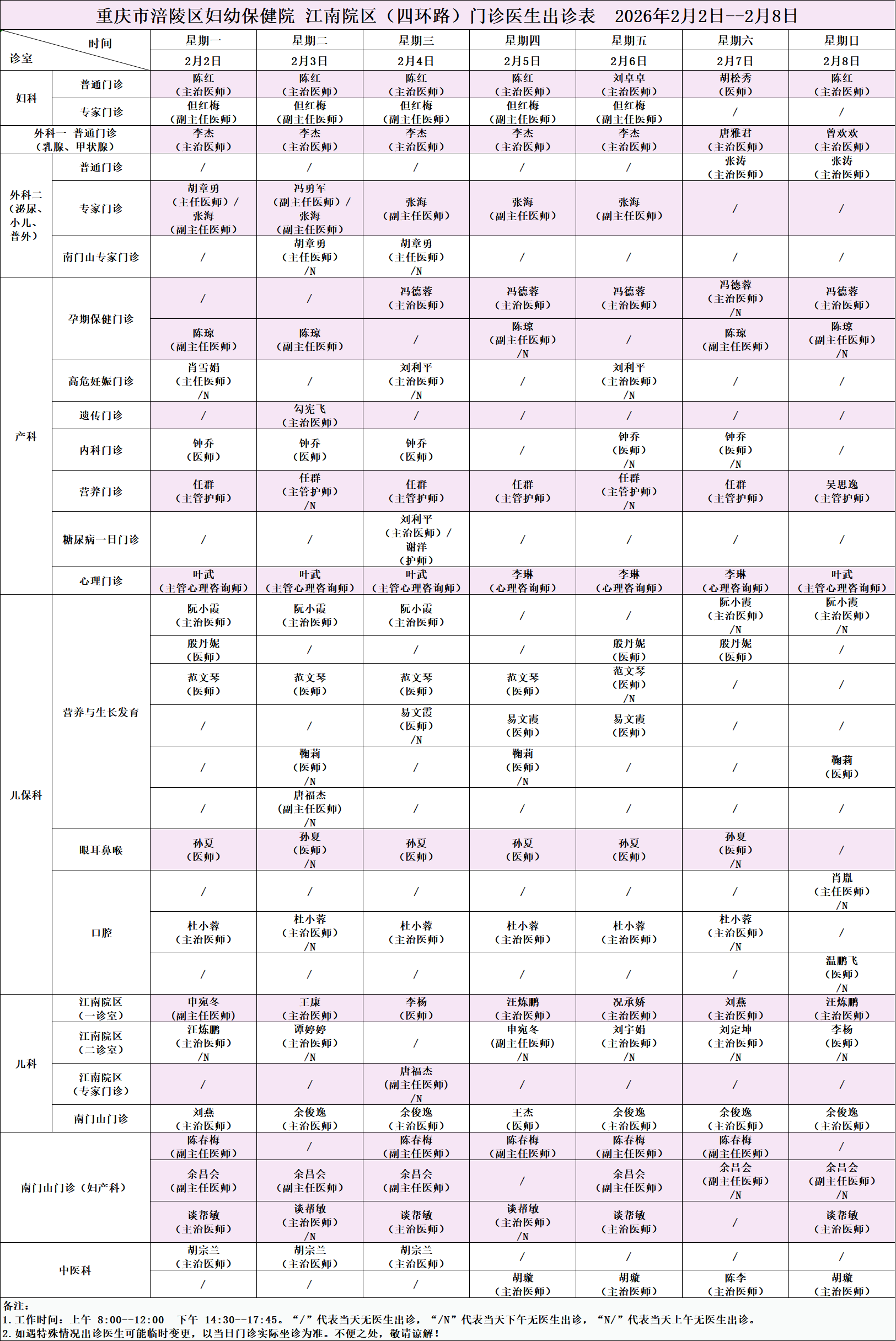 为方便您及时了解我院两院区门诊医生出诊情况,现将下周出诊表公示如下,请您合理安排出行和时间。您还可以关注“重庆市涪陵区妇幼保健院”微信服务号、公众号,在“就诊服务”栏目中在线预约挂号。