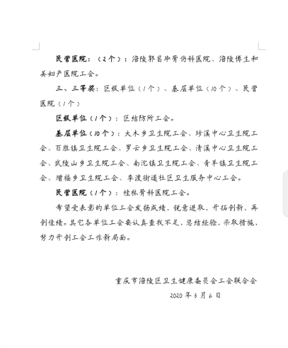 涪陵区妇幼保健院工会在区卫生健康委工会联合会2019年度基层工会考核工作中荣获一等奖。