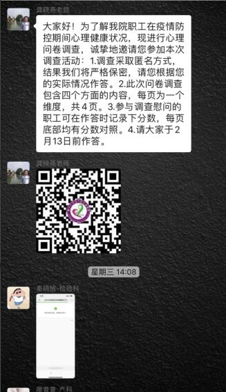 在抗击疫情的特殊时期,院工会为了解单位职工在疫情防控期间心理健康状况,与心理健康门诊医师共同设置了职工心理健康“问卷星”网络匿名自评问卷调查表,同时在全院范围内开展了自评调查,对心理健康自评情况较差的职工及时与心理医师进行了沟通,得到了心理医师及时有效的干预和疏导,让职工不良情绪得到发泄,改变了对疫情的消极认识,焕发精神热情投入到工作中。