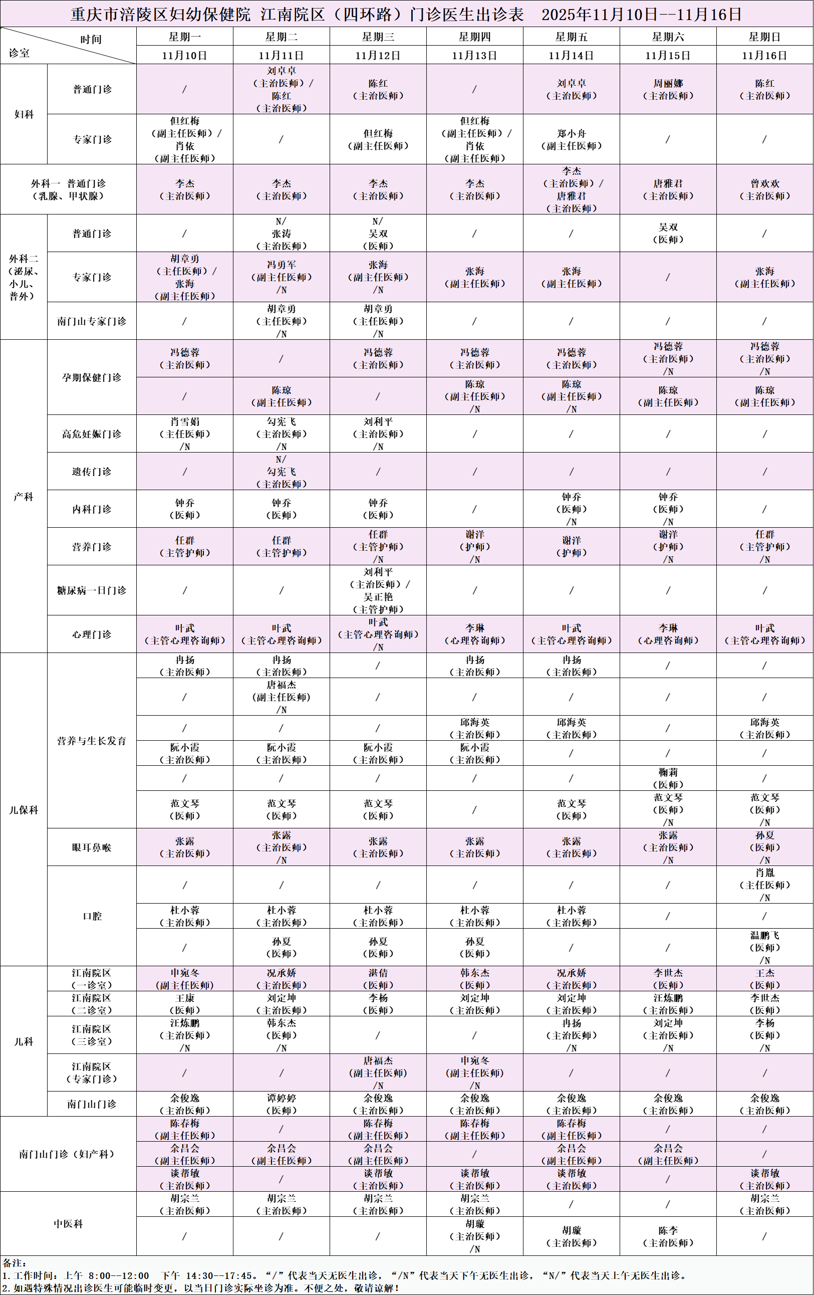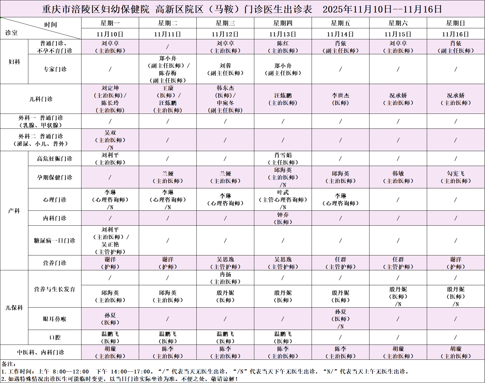 【门诊排班】2025年11月10日—11月16日|重庆市涪陵区妇幼保健院门诊出诊表
