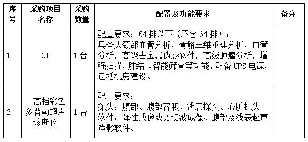 为满足我院业务发展需求,我院拟采购CT、高档彩色多普勒超声诊断仪各一台,欢迎具有合格资质且有良好信誉和售后服务能力的生产厂家或经厂家授权的总代理商参与产品推介。