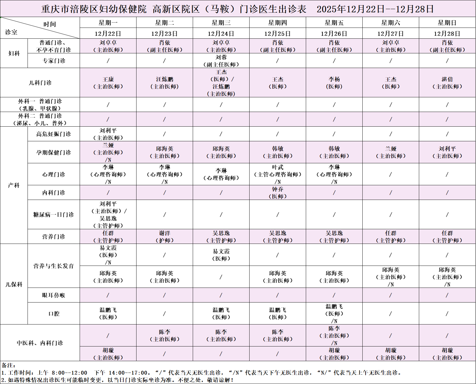 为方便您及时了解我院两院区门诊医生出诊情况,现将下周出诊表公示如下,请您合理安排出行和时间。您还可以关注“重庆市涪陵区妇幼保健院”微信服务号、公众号,在“就诊服务”栏目中在线预约挂号。